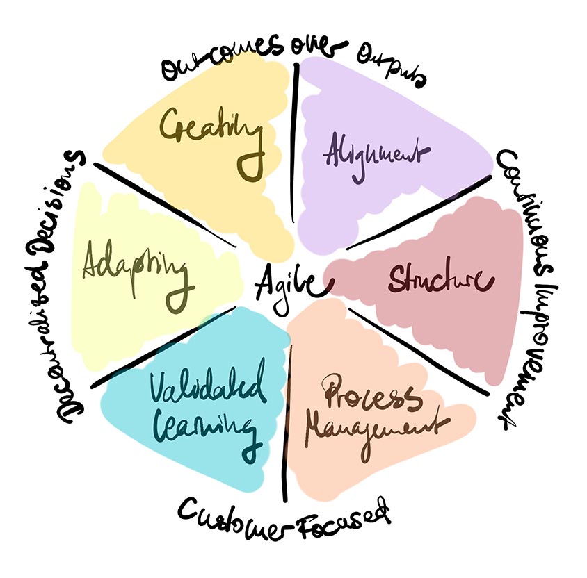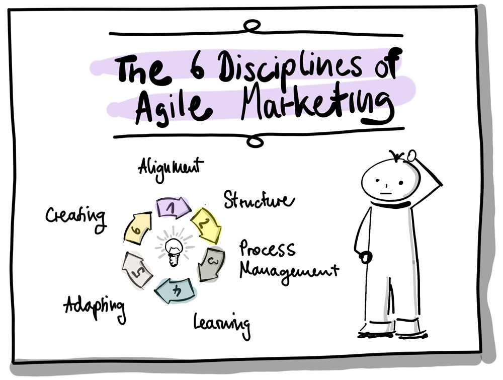 - Der zweite Teil beschäftigt sich mit den titelgebenden 6 Disziplinen des Agilen Marketings: Alignment, Structure, Process Management, Validated Learning, Adapting to Change und Creating Remarkable Customer Experiences.